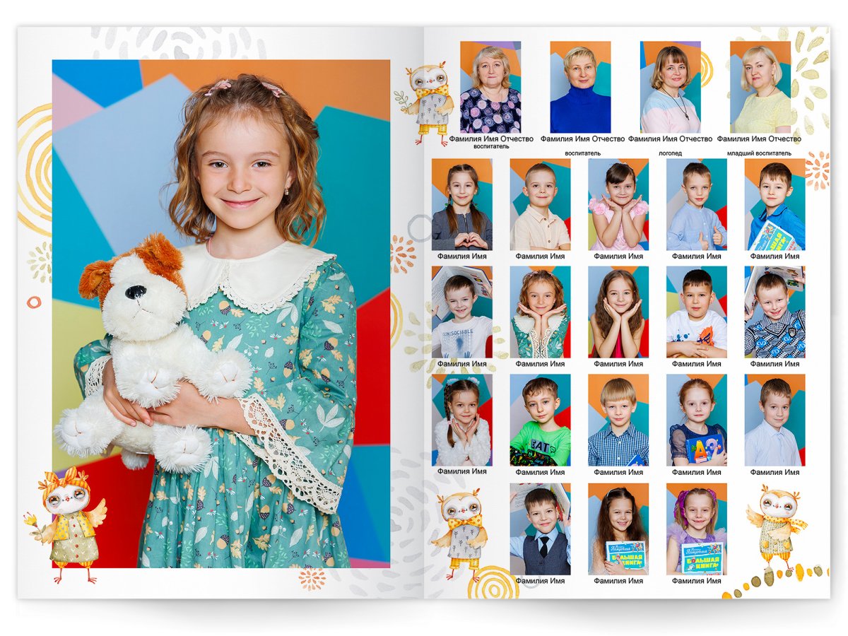 • Портреты всех детей и воспитателей на развороте или странице